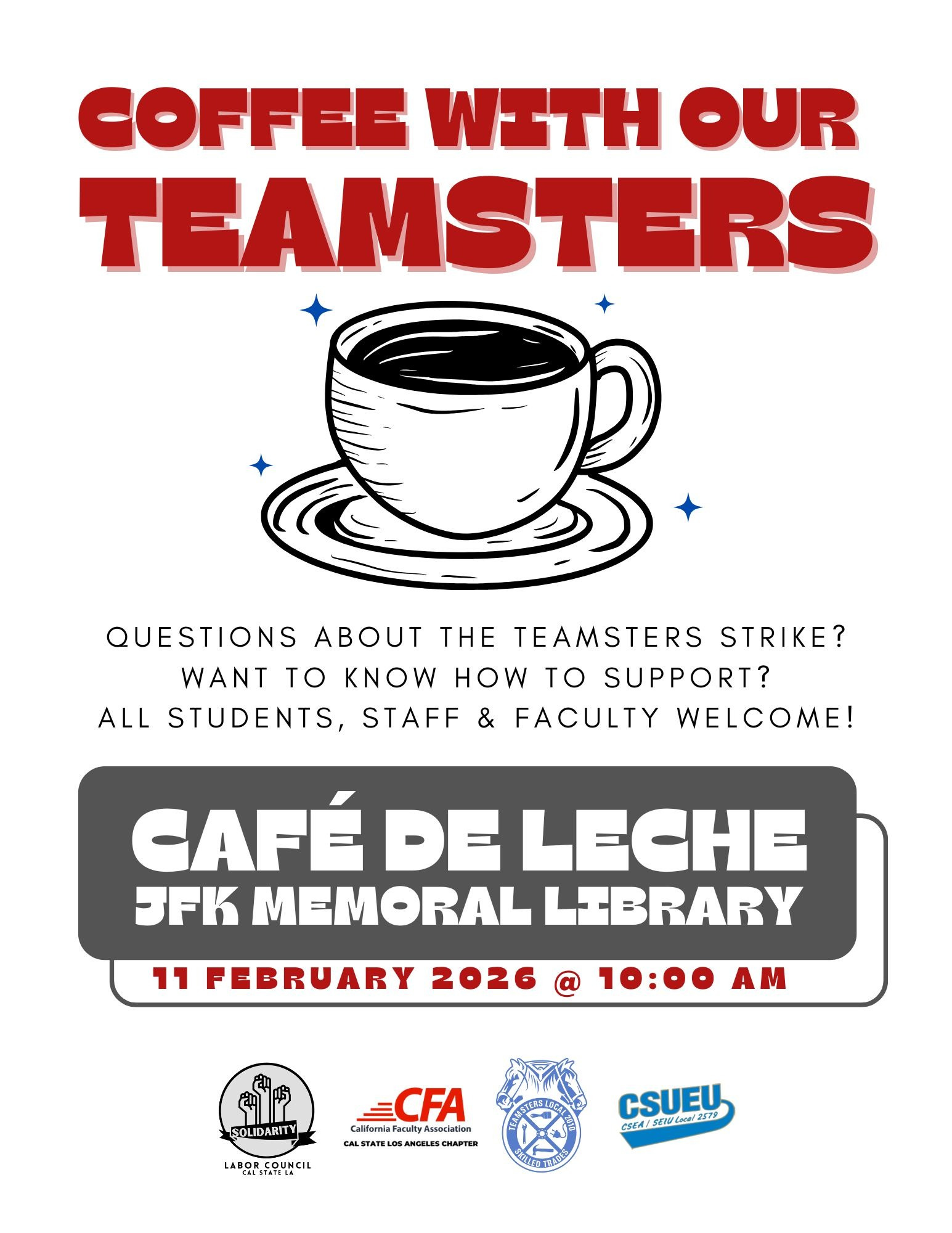 If you have any questions about participating in the strike, contact MAlvarado@calfac.org, or join us Wednesday, 2/11 from 10-11 AM at Cafe de Leche (LIB) for Coffee with our Teamsters. Your participation supports our campus community for our colleagues - we’ll see you on the picket lines!