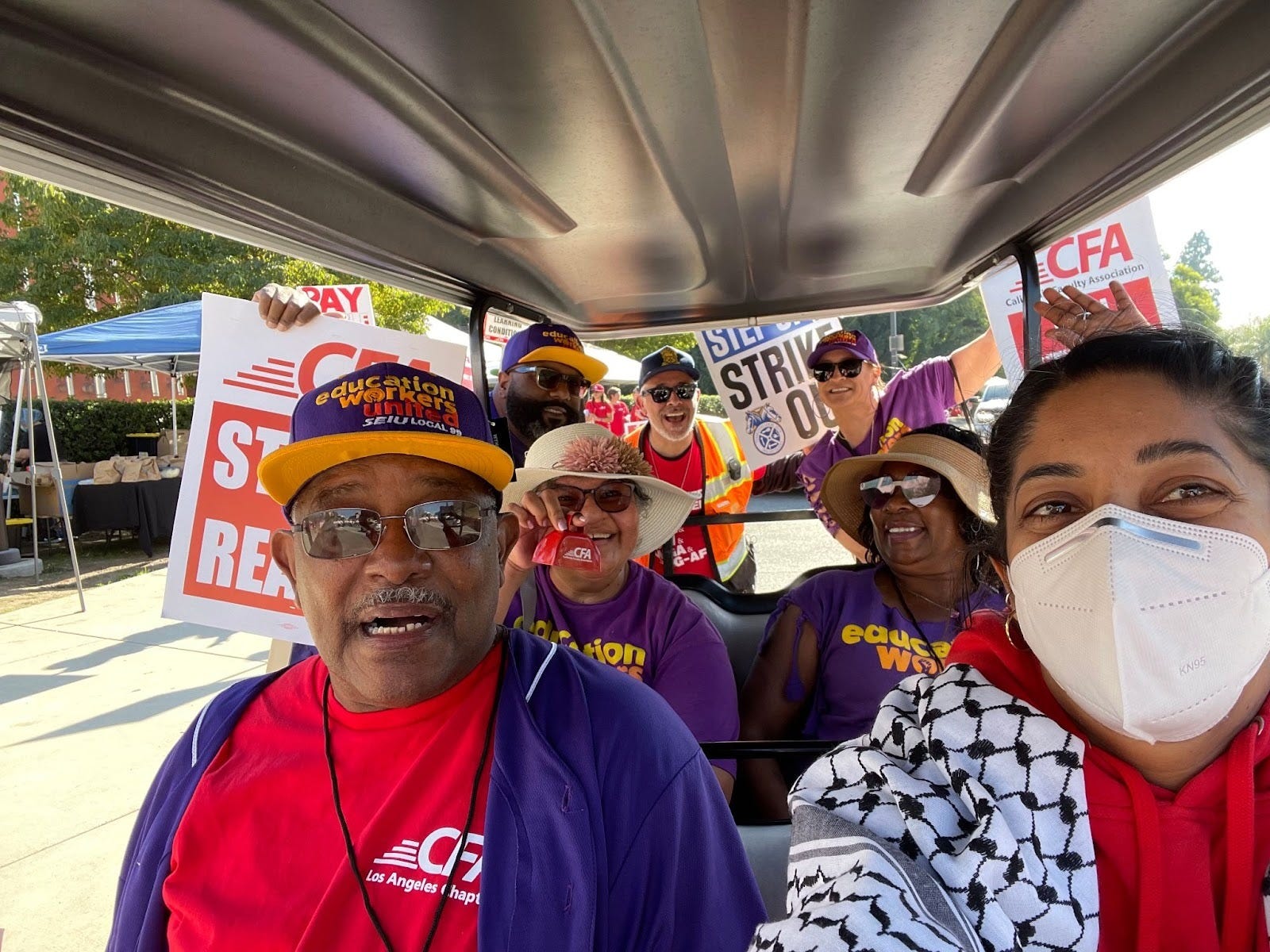 [Bottom image: Seven members of SEIU 99, Teamsters 2010, and CFA riding in a golf cart to the picket line with CFA shirts on during CFA’s strike in 2023-2024.]