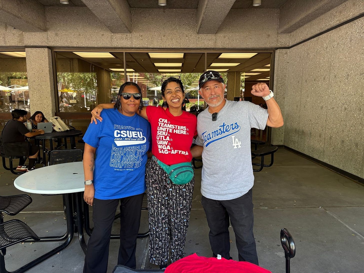 At Cal State LA, union solidarity is a personal matter! We look forward to the first Wednesdays of the month, when all the campus unions table in front of the Golden Eagle statue. We do that to increase visibility and recruit new members–but also to share stories about our families, support each other’s struggles, and share critical information and resources. Teamsters are some of our most trusted colleagues on campus. At Cal State LA, we really are one big (pretty functional) union family!