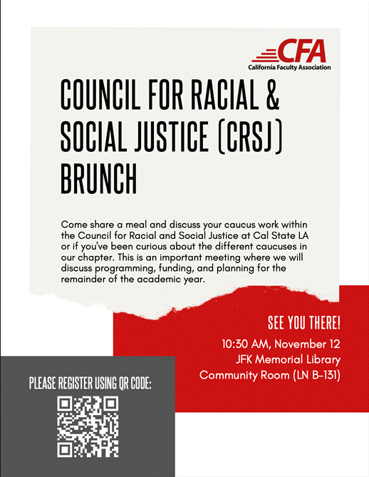 We invite all CFA-LA members to join the Council for Racial and Social Justice (CRSJ) for a brief meal with a brief meeting this Wednesday, November 12, in the Community Room in the Library from 10:30 AM to 12 PM.